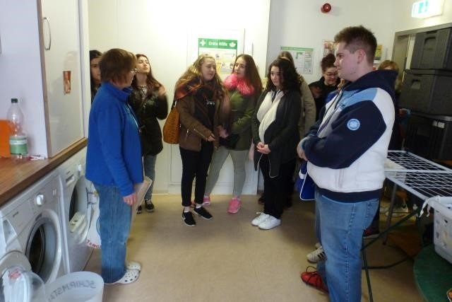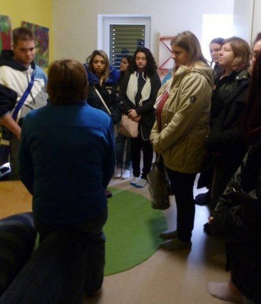 Die Leiterin, Frau Bloß führte uns durch das Haus mit Krabbelstube, Kinderladen und Kinderhort. Sie zeigte uns die Einrichtung und erzählte uns von den Anforderungen, die in der Praxis an den Beruf der Kinderpflegerin gestellt werden. Neben vielen hauswirtschaftlichen Tätigkeiten, wie Essen