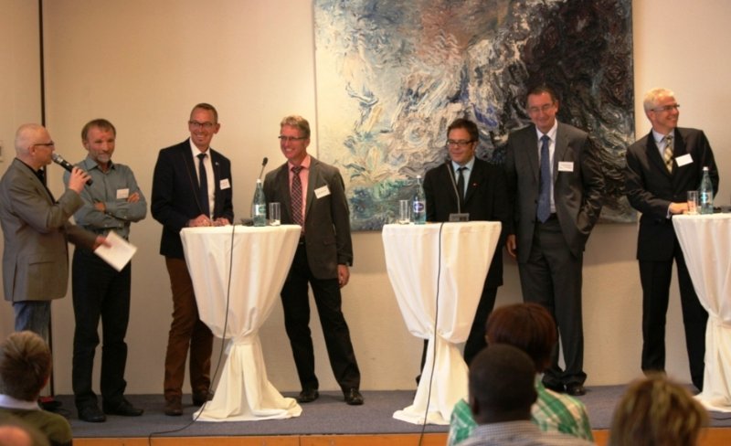 In der Abschlussrunde diskutierten Bezirksrat Dr. Hiemeyer, als Vertreter des Bezirkstagspräsidenten, Herr Baumüller (Direktor des BAW), Herr Rauch (Regionaldirektion Bayern der Bundesagentur für Arbeit), Herr Scheuerer (Ausbildungsleiter bei Siemens Nürnberg), Herr Kastner (IHK Nürnberg) und Herr Partuzzi (Deutscher Gewerkschaftsbund) über die Zukunft der Inklusion und welche Chancen und Möglichkeiten es künftig für Jugendliche mit Lernbehinderung geben werde. Herr Partuzzi sicherte zu, das BAW im Berliner Bundestag bekannt zu machen und als Vorzeigeprojekt für Inklusion zu präsentieren.