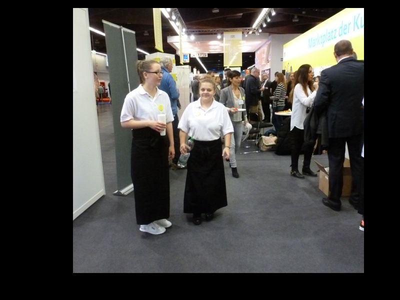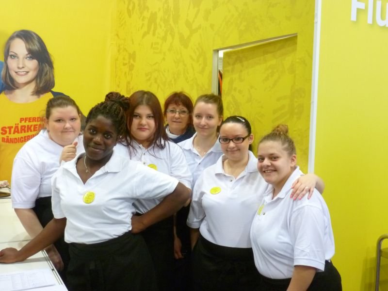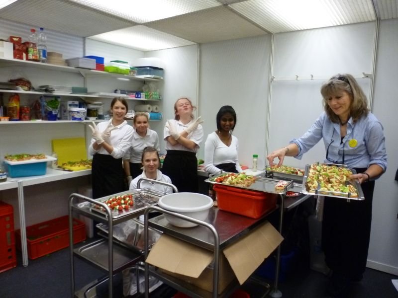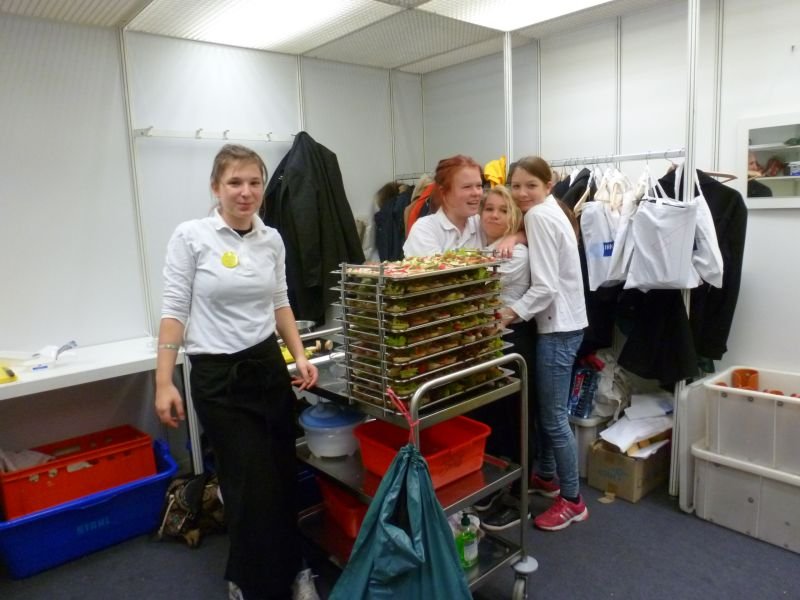 Wir arbeiteten in zwei Schichten. Die halbe Klasse war jeweils zur Frühschicht eingeteilt, die andere Hälfte kam zur Spätschicht. Nach zwei Tagen wurden die Schichten getauscht. Es stellte sich heraus, dass die Frühschicht viel arbeitsintensiver als die Nachmittagsschicht war. Morgens waren schon sehr zeitig viele Besucher am Stand und wir stellten im Akkord Häppchen her. Auch Kaffee und Tee mussten rechtzeitig auf der Theke bereit stehen. Während im Küchenabteil die fleißigen Häppchenproduzentinnen aktiv waren, mussten immer zwei Schülerinnen an der Standtheke Kaffee, Tee und Kaltgetränke ausschenken und für Häppchennachschub sorgen. Am Nachmittag beruhigte sich der Besucheransturm weitgehend und wir konnten auch selbst auf der Messe einige Erkundigungen einholen.