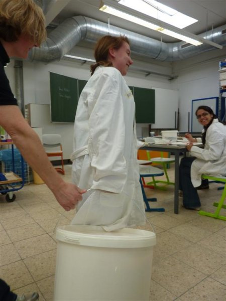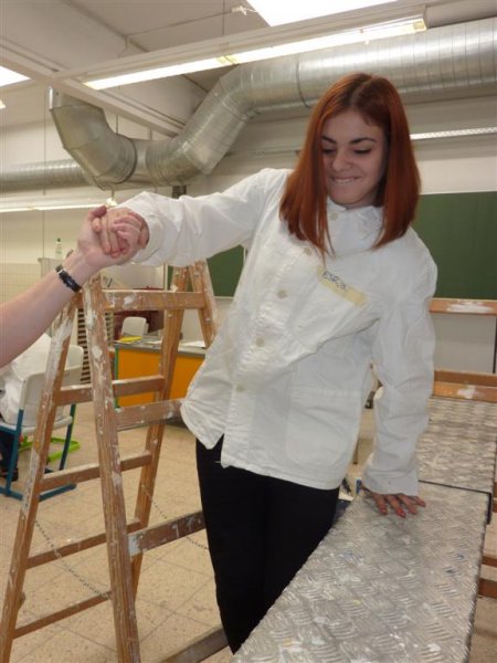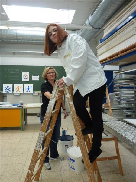 Da war beim Aufzeichnen und Ausmalen eines Emblems erst einmal Fingerspitzengefühl und Genauigkeit gefragt, sowie ein Gefühl für Farbe. Danach konnten die Mädchen ausprobieren, wie es um ihre Körperkräfte bestellt ist, indem sie einen 25 Kilo schweren Farbeimer auf eine Leiter heben sollten. Ihre Höhentauglichkeit konnten sie auf einem kleinen Gerüst überprüfen. Das alles sind neben den theoretischen Anforderungen wichtige Grundvoraussetzungen für den Malerberuf.